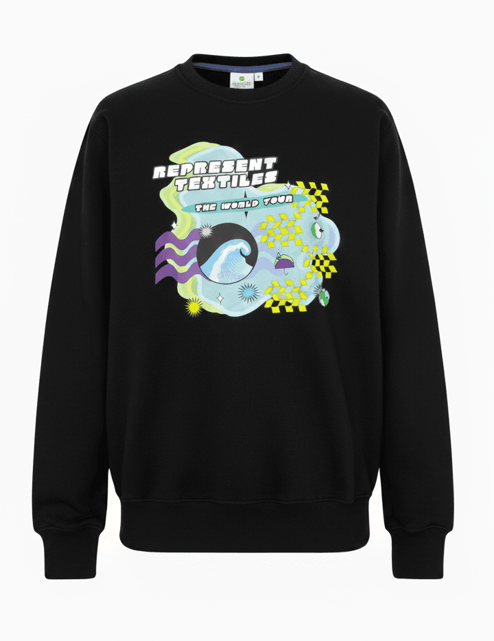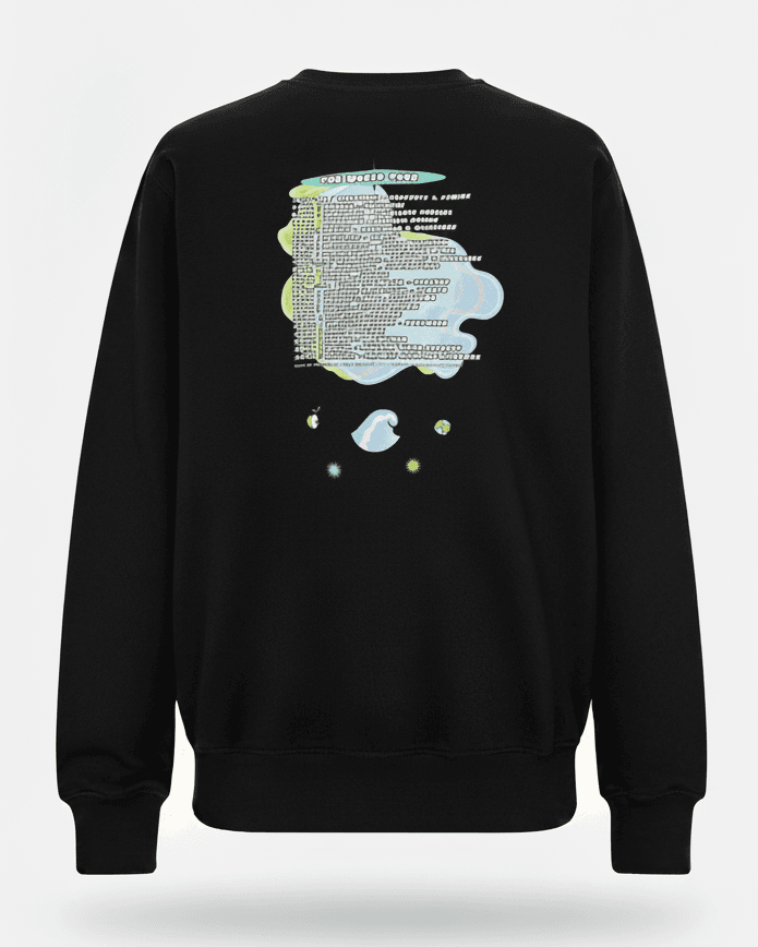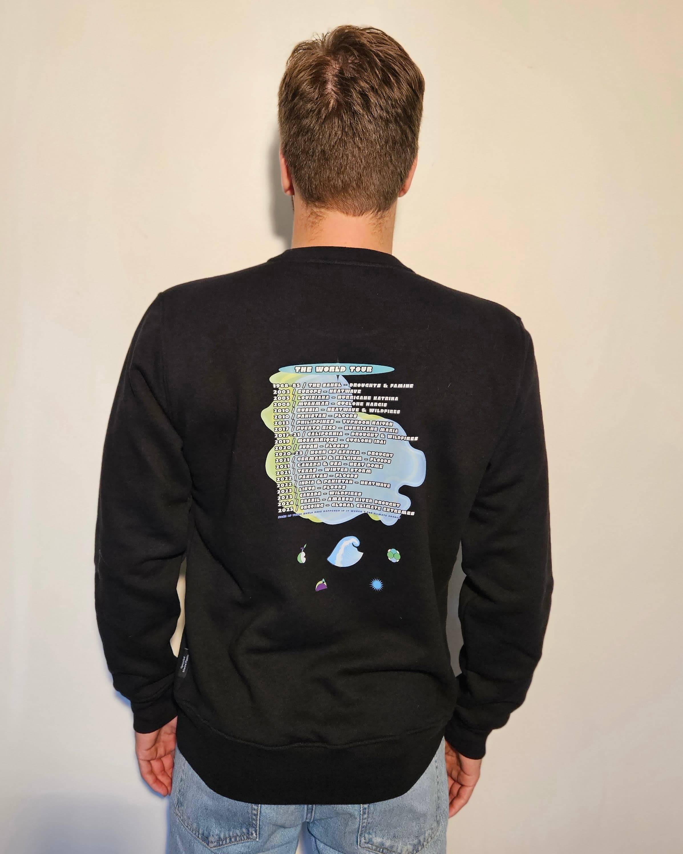 An eye-catching front and back printed sweater that reminds you of your favourite merch from concerts. At first glance it looks like a crewneck from a trippy concert. The ‘world tour’ is a list of the worst natural disasters that have been attributed to climate change. It's sad, but we keep it real here. 30% of profits go to charity. Model is 5'11" and is wearing a size L.